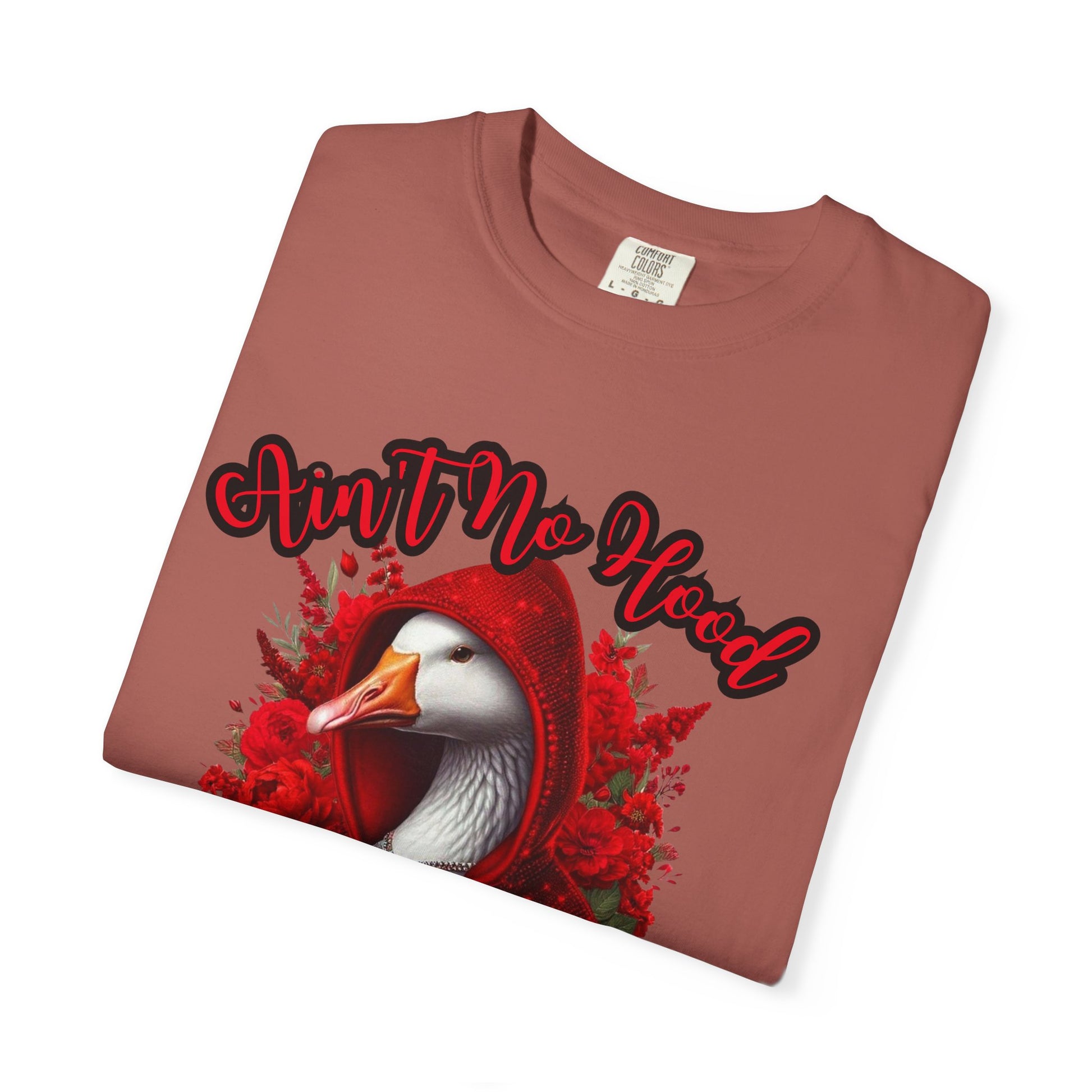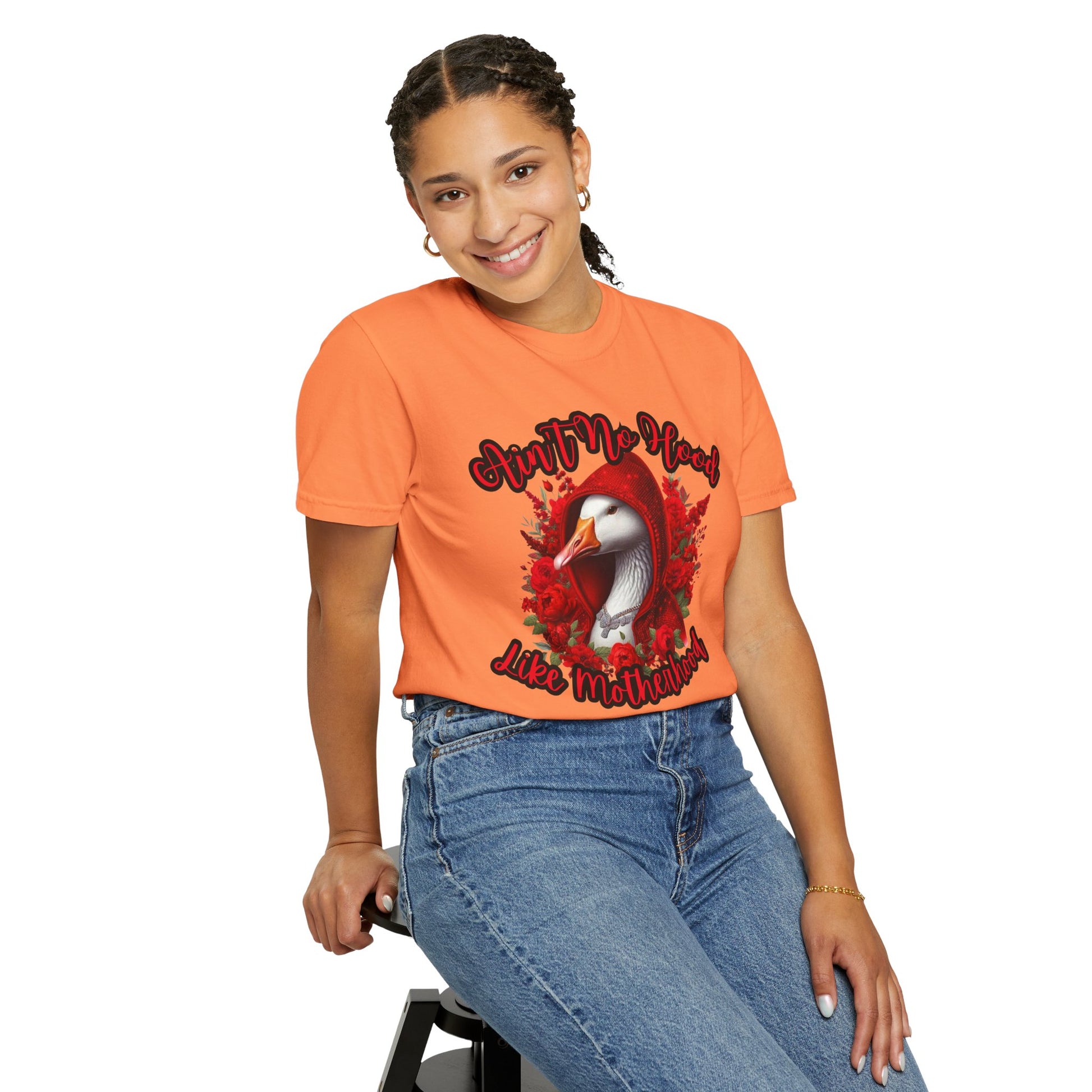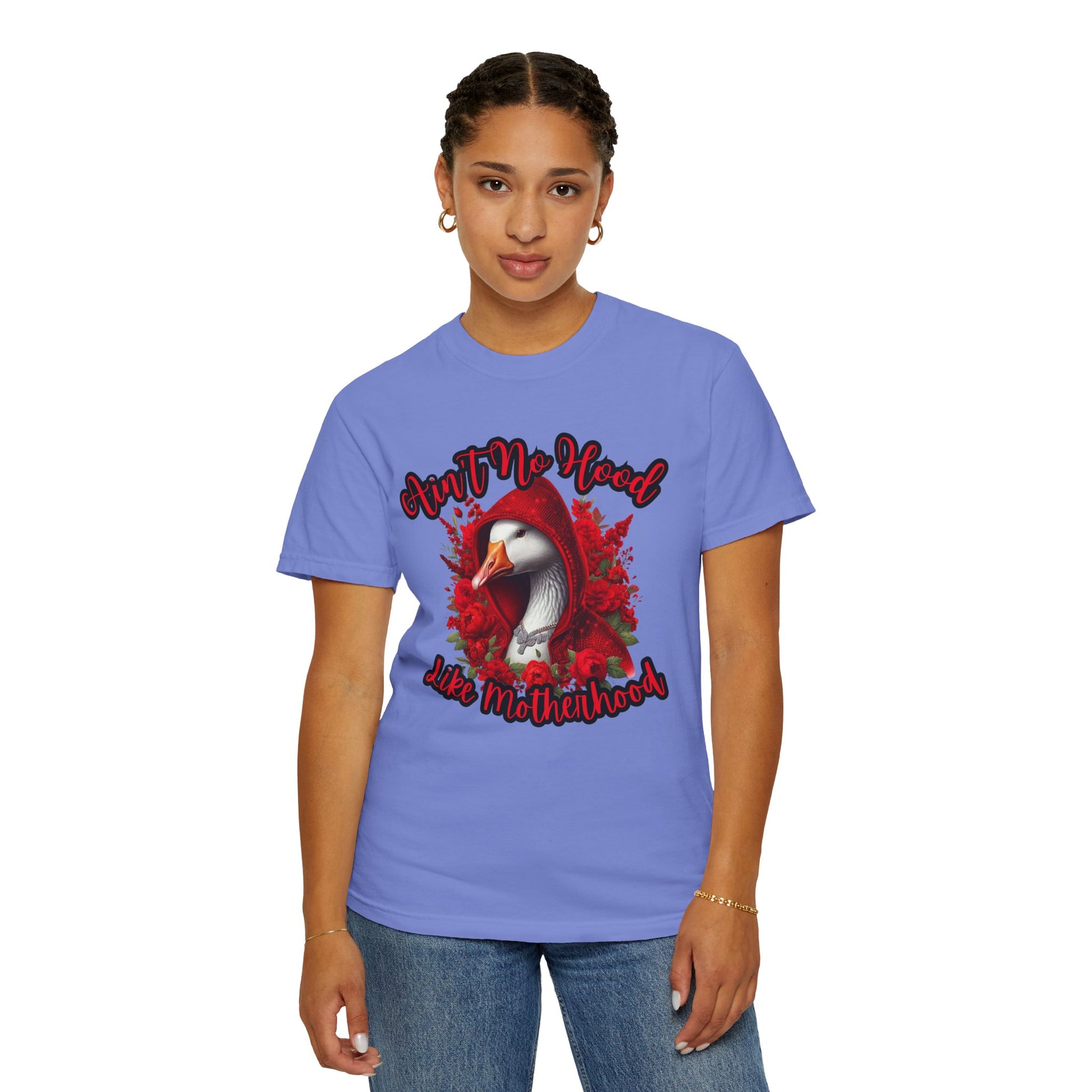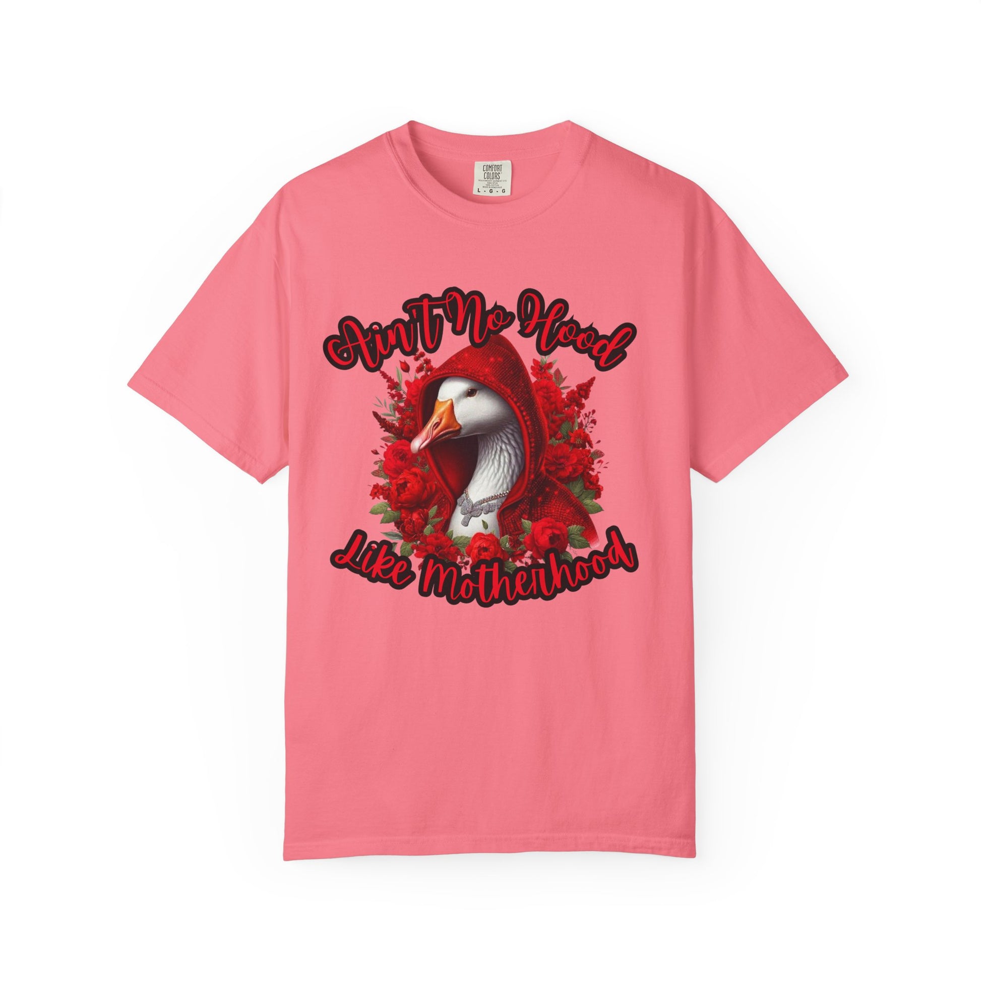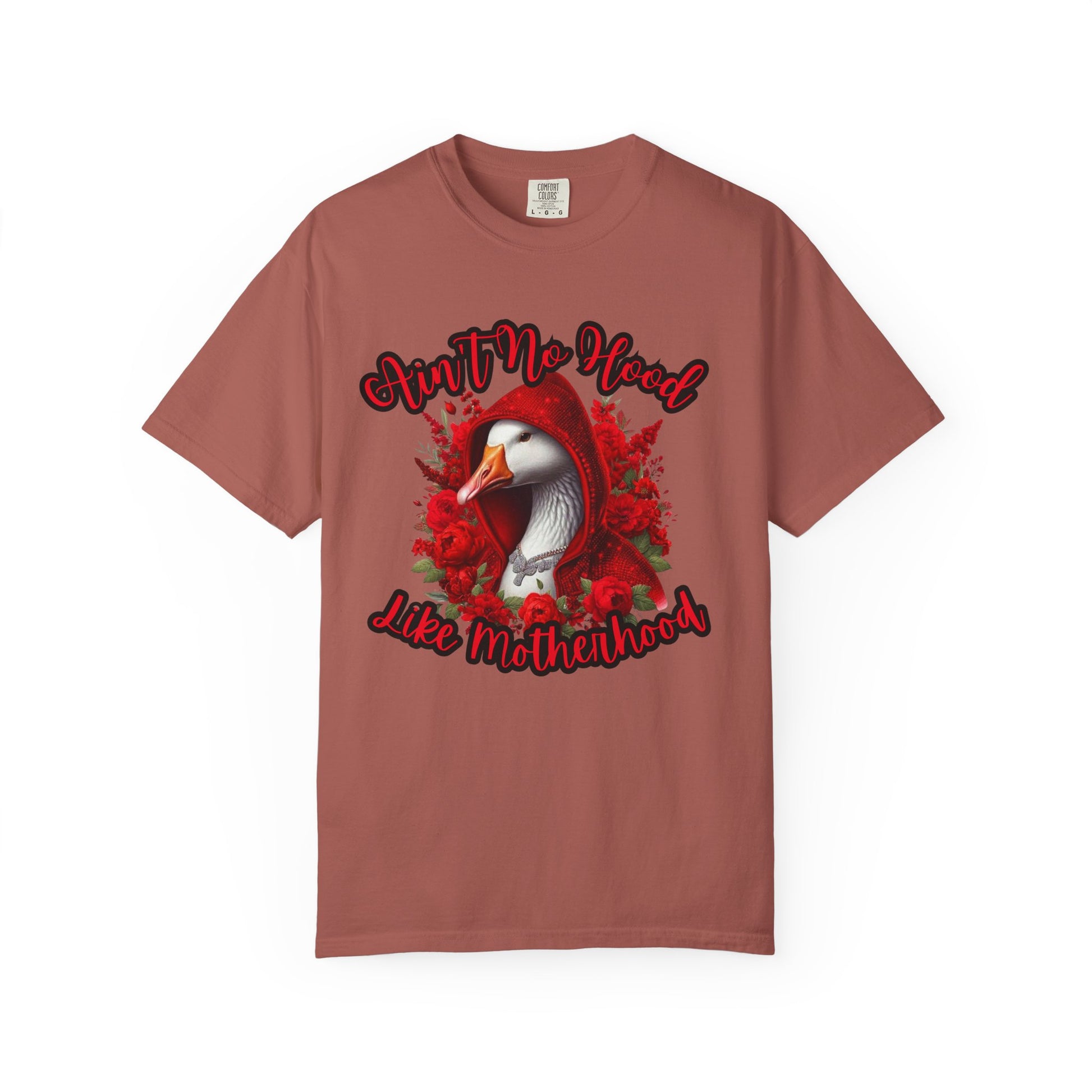 This hilarious “Ain’t No Hood Like Motherhood” shirt features a fierce goose rocking a sparkling red hoodie surrounded by roses — the ultimate symbol of mom strength, sass, and beauty.