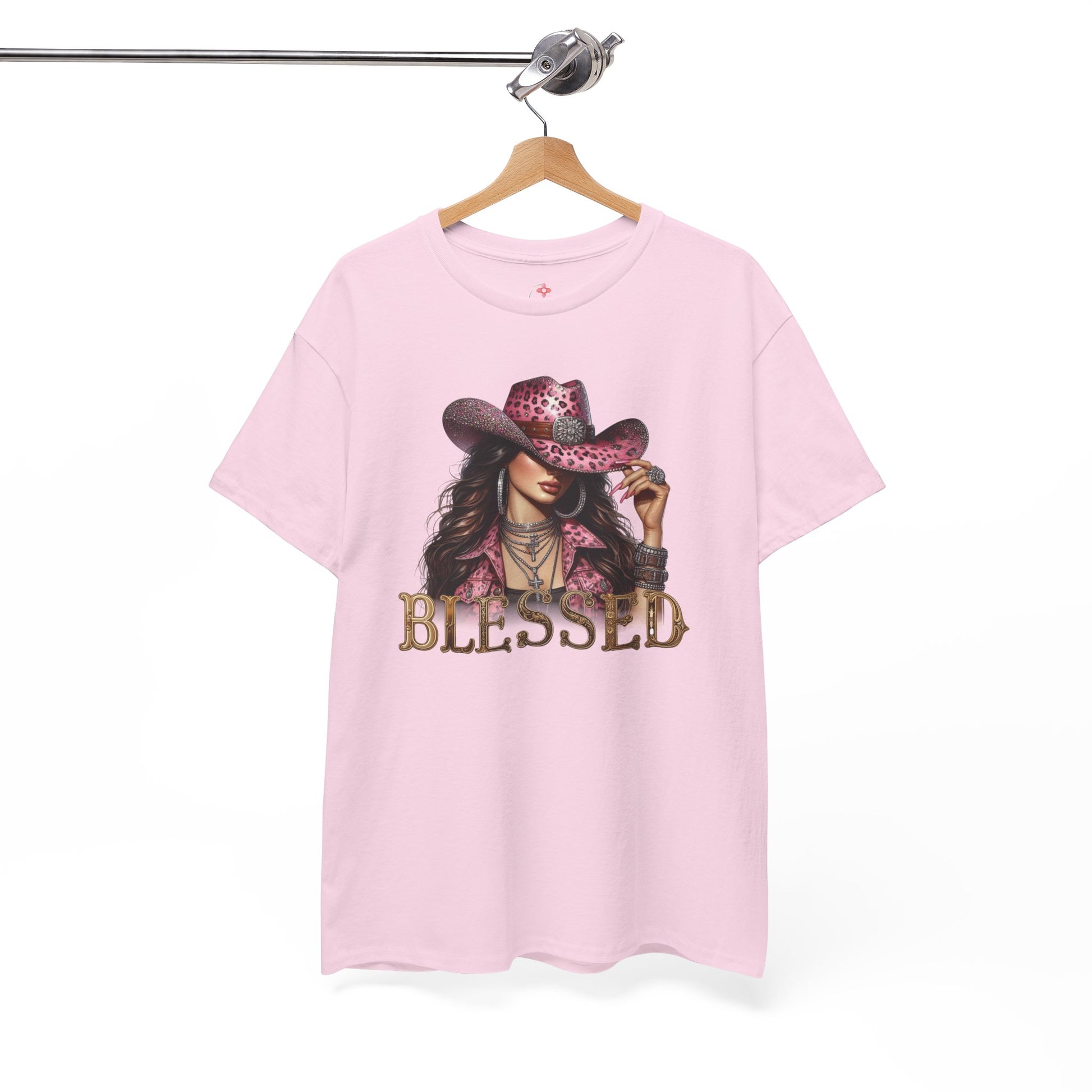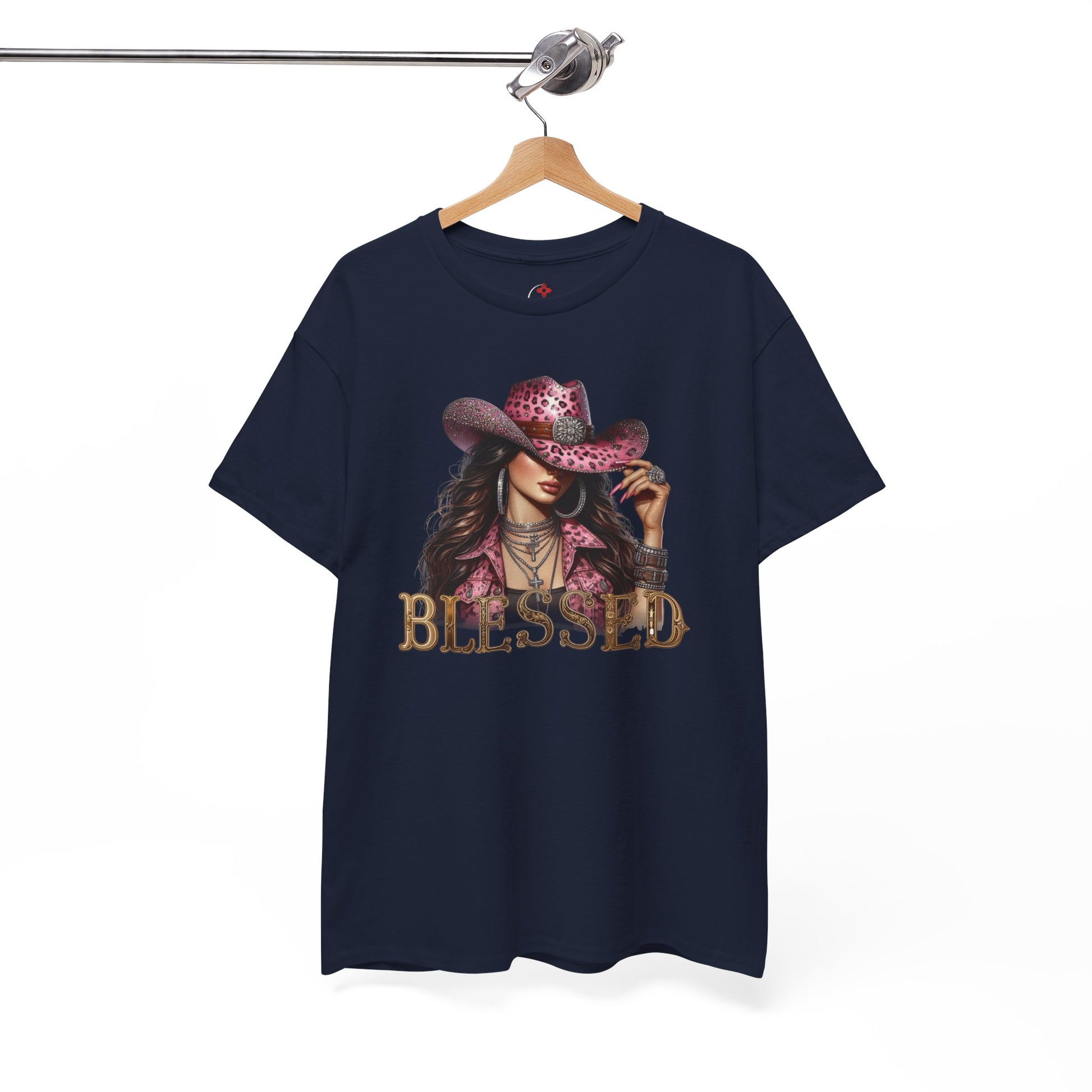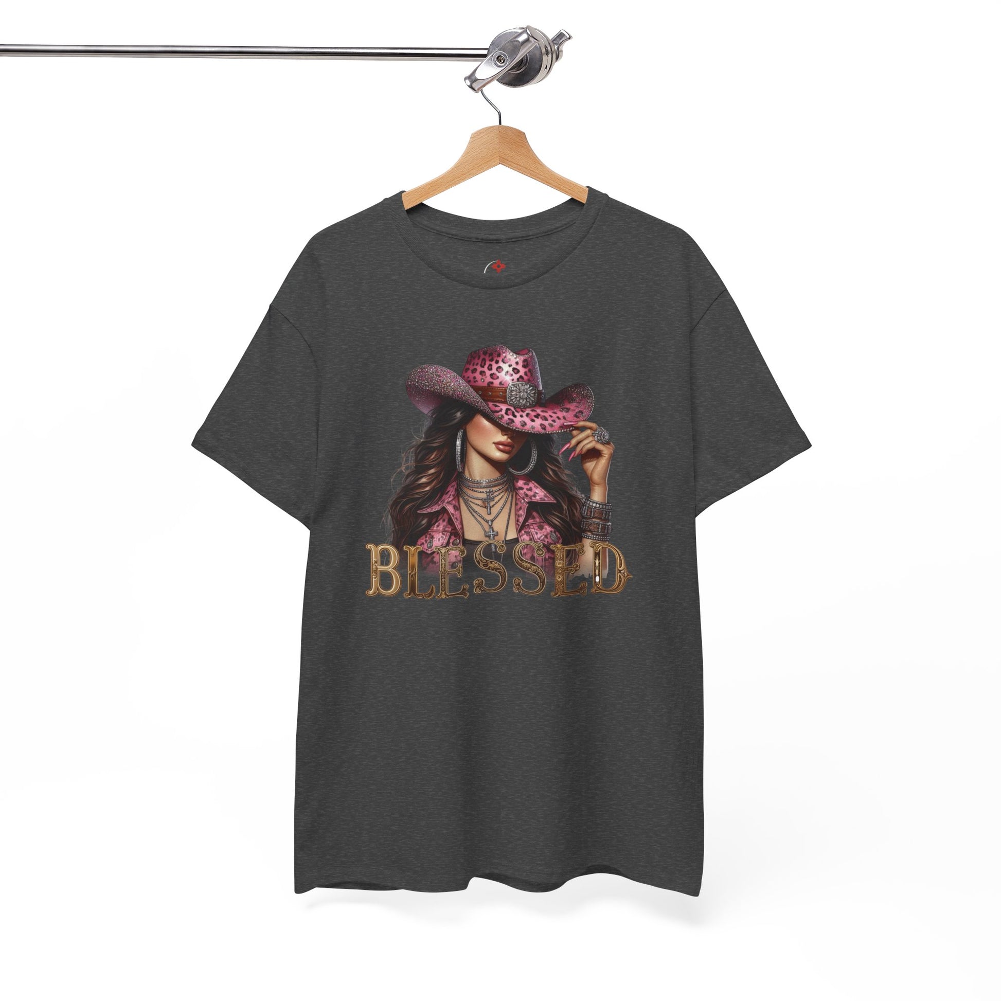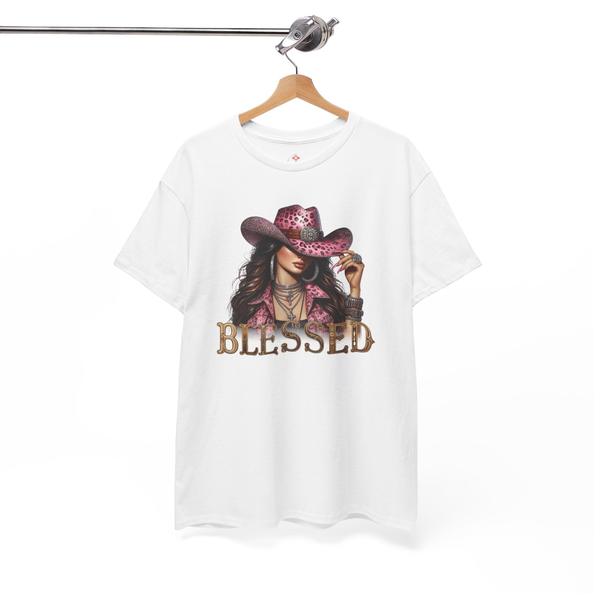 This “Blessed” shirt features a stunning Western cowgirl in a pink leopard hat and glam jewelry — the perfect blend of southern sass and spiritual confidence. Designed for the modern cowgirl who knows her worth and walks in gratitude, this tee makes a statement wherever you go.