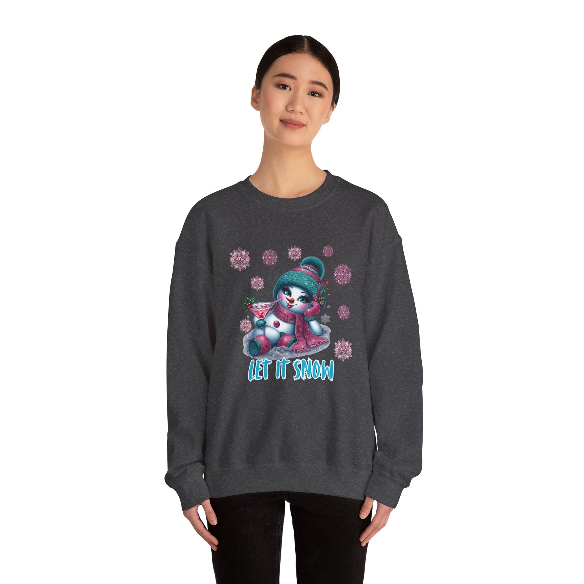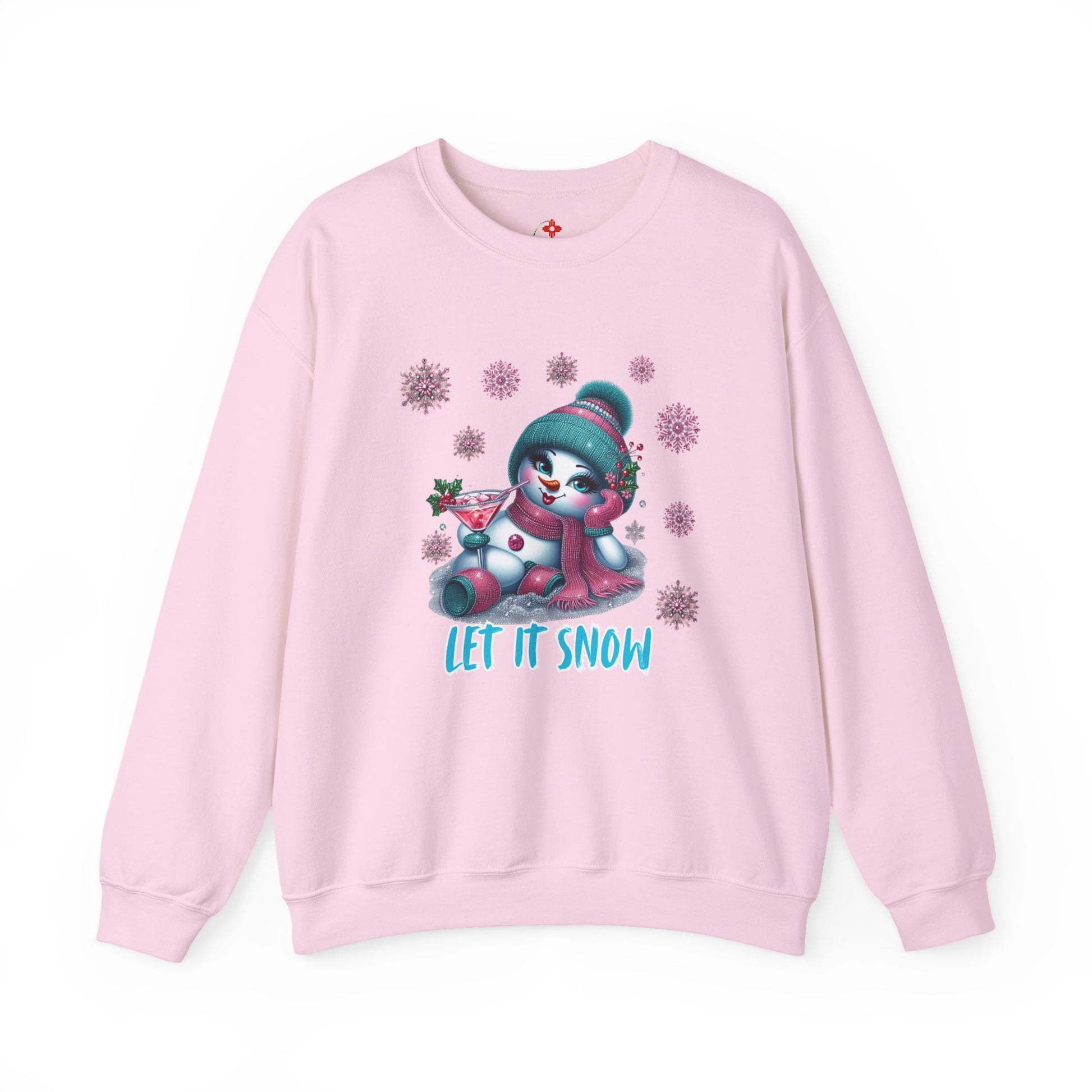ThisΒ βLet It Snowβ shirt features a glamorous snowwoman in a cozy beanie and scarf, sipping a festive cocktail surrounded by glittery snowflakes. Perfect for holiday parties, cozy nights in, or anyone who loves a little sparkle with their winter cheer.